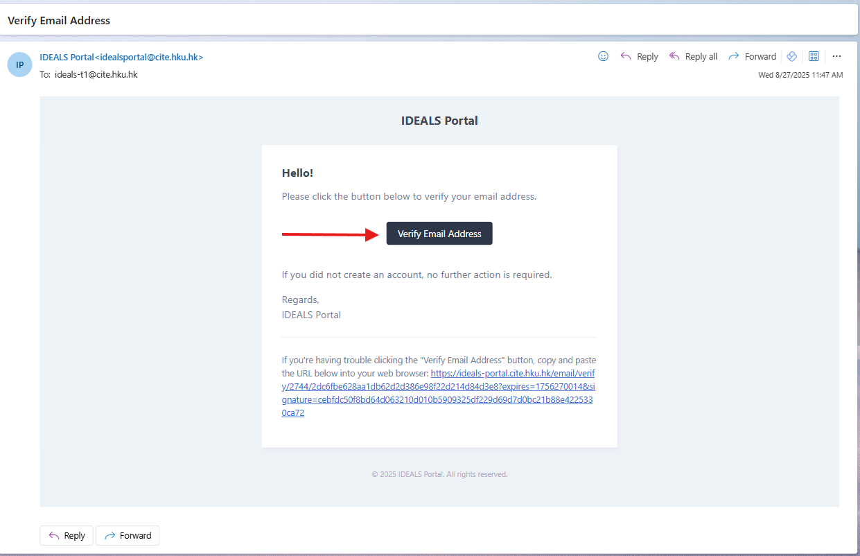 Wait 2–3 minutes, then check your email inbox for the verification email from the IDEALS Portal. Click the verification link in the email.