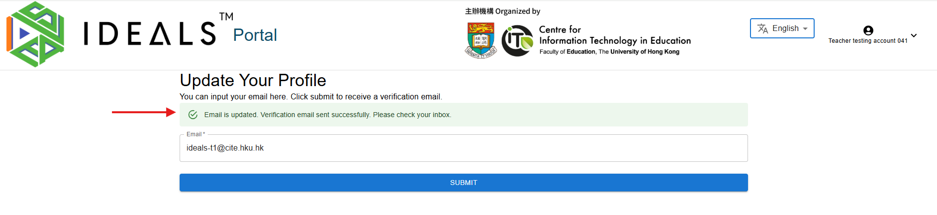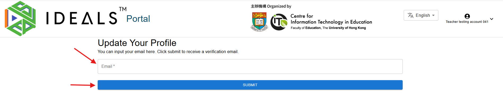 If you are a teacher at EdCity, you will be redirected to the "Edit Profile" page to verify your email. This step is necessary because all IDEALS sub-systems require a verified email, and EdData currently does not provide teachers' email addresses to service providers.