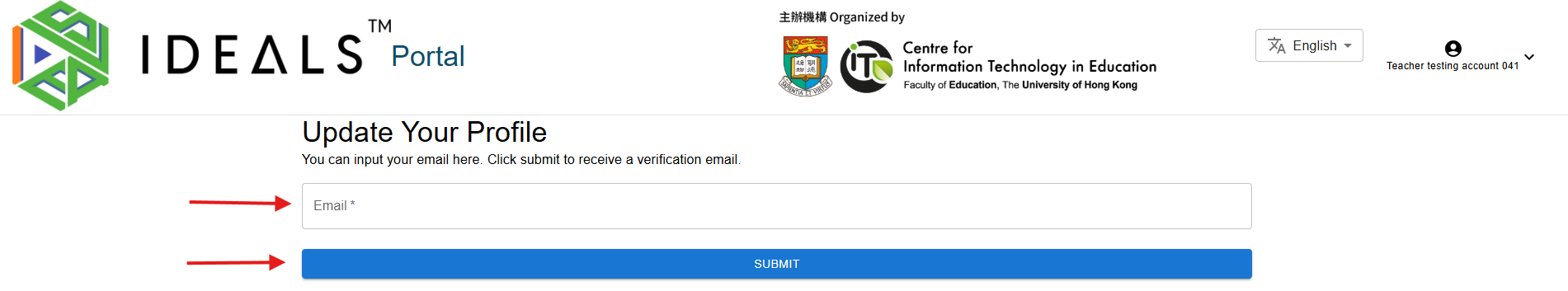 If you are a teacher at EdCity, you will be redirected to the "Edit Profile" page to verify your email. This step is necessary because all IDEALS sub-systems require a verified email, and EdData currently does not provide teachers' email addresses to service providers.