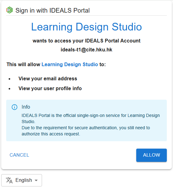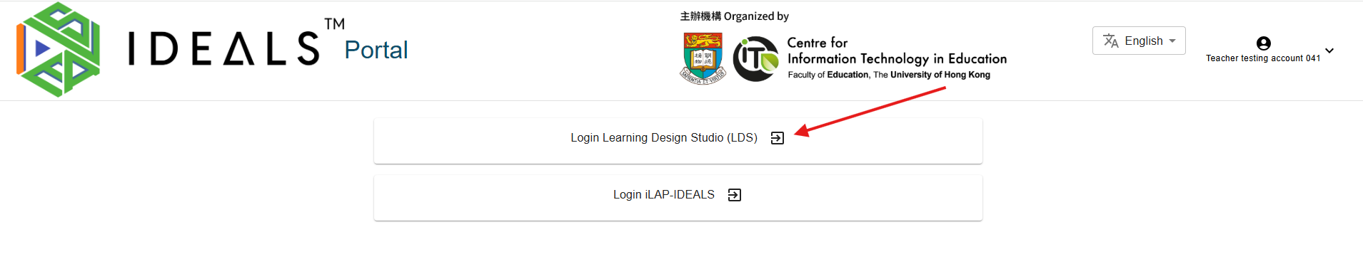 From the Gateway Page of the IDEALS Portal (https://ideals-portal.cite.hku.hk/gateway), click the "Login Learning Design Studio (LDS)" button.