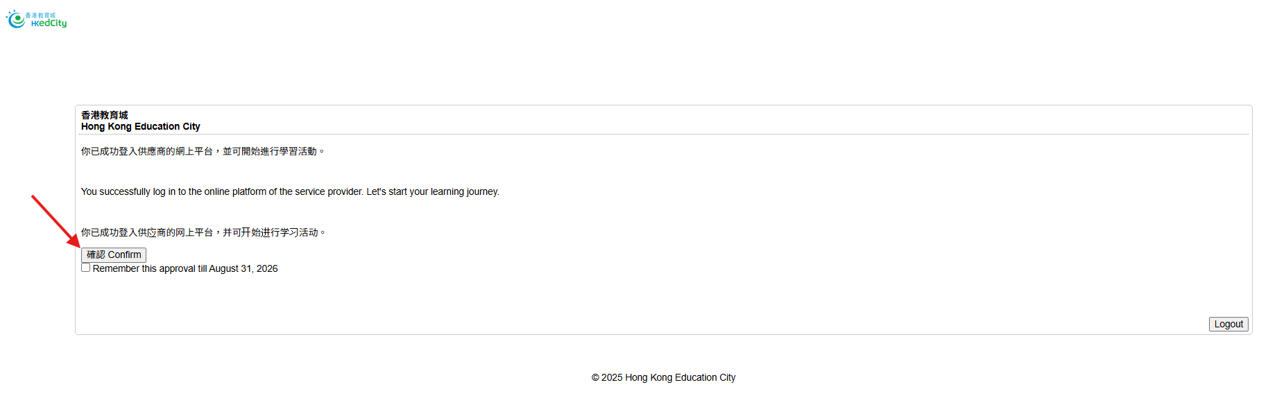 在您使用 EdConnect 登入後,系統將會將您重定向到一個授權同意頁面。請點擊「確認(Confirm)」按鈕,以繼續進行下一步操作。