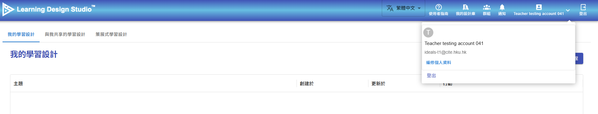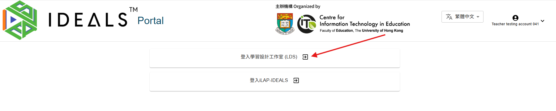 從 IDEALS Portal網站的閘道頁面 (https://ideals-portal.cite.hku.hk/gateway),點擊「登入 Learning Design Studio (LDS)」按鈕
