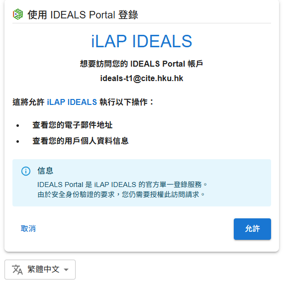 Portal 網站會請求授權,以允許 iLAP-IDEALS 孲取您的帳戶。請點擊「允許 (ALLOW)」