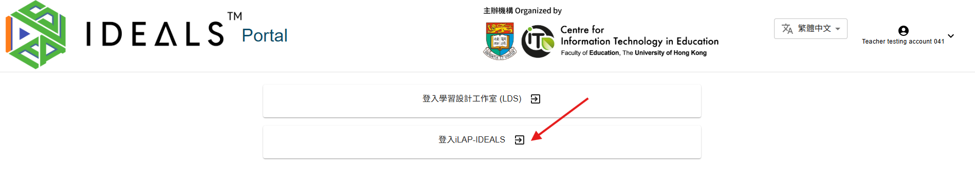 從閘道頁面 (https://ideals-portal.cite.hku.hk/gateway),點擊「登入 iLAP-IDEALS」按鈕