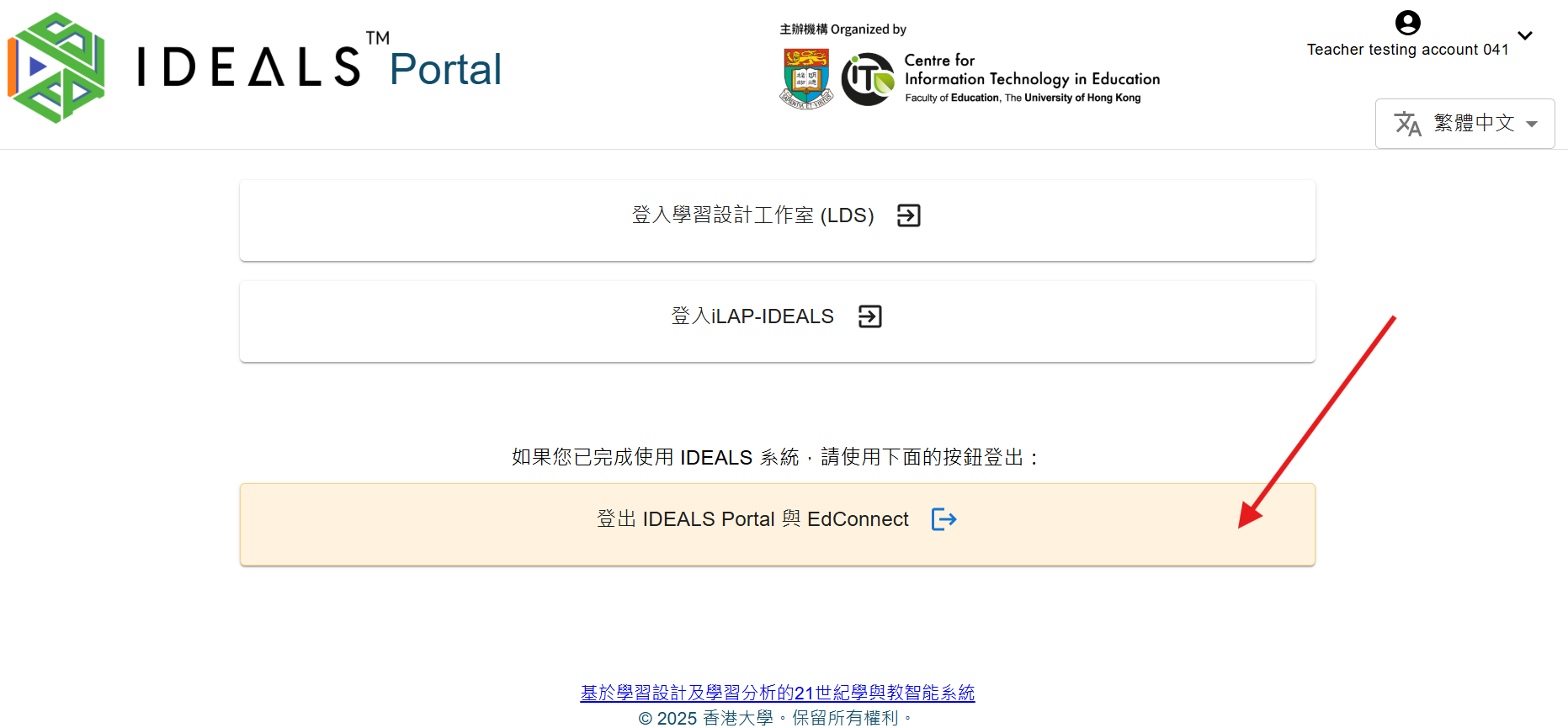 請點選「Logout IDEALS Portal and EdConnect」按鈕以登出入口網站並終止您的 EdConnect 單一登入會話。登出後您將被導回 IDEALS 入口網站首頁。