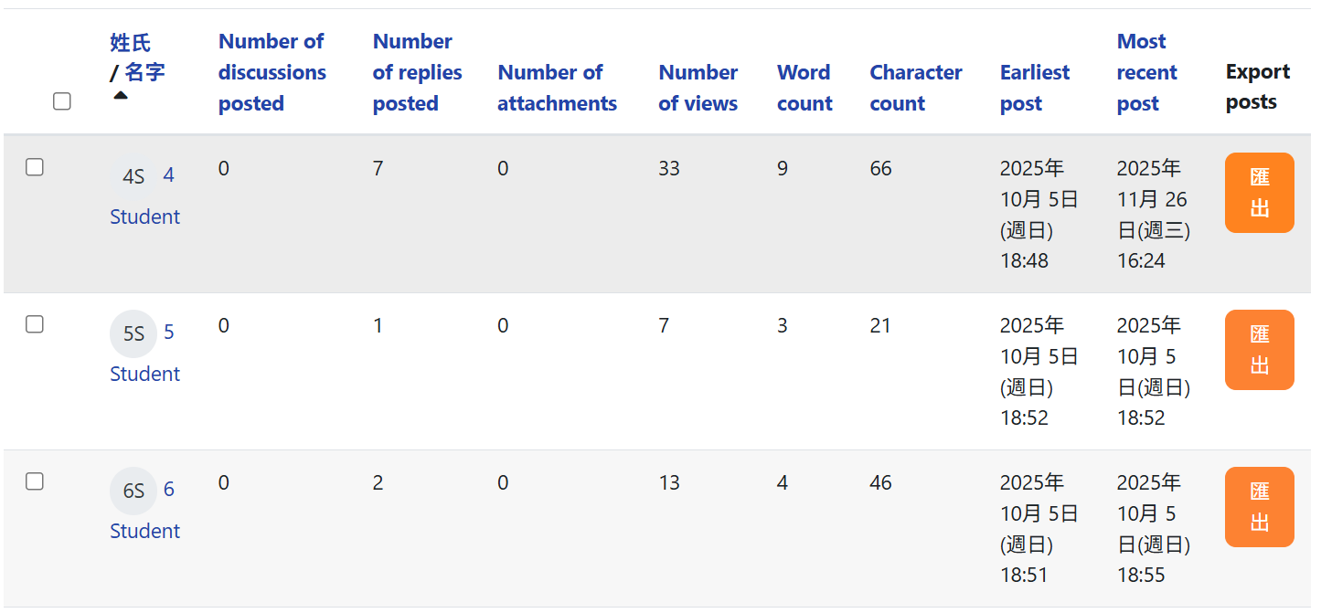 下圖以一個實際例子說明:在「討論區總結報告」中,若某位學生的 Number of discussions posted 和 Number of replies posted 均偏低,但 Number of views 較高,教師便可推斷該生主要以瀏覽為主、較少主動發言,從而考慮在課堂中主動提問或提供更多發言機會;相反,若學生的發帖及回覆次數都很高,則顯示其在討論中十分活躍,教師可進一步引導其擔任小組召集人或學習夥伴角色。下圖即為「討論區總結報告」的示例畫面。