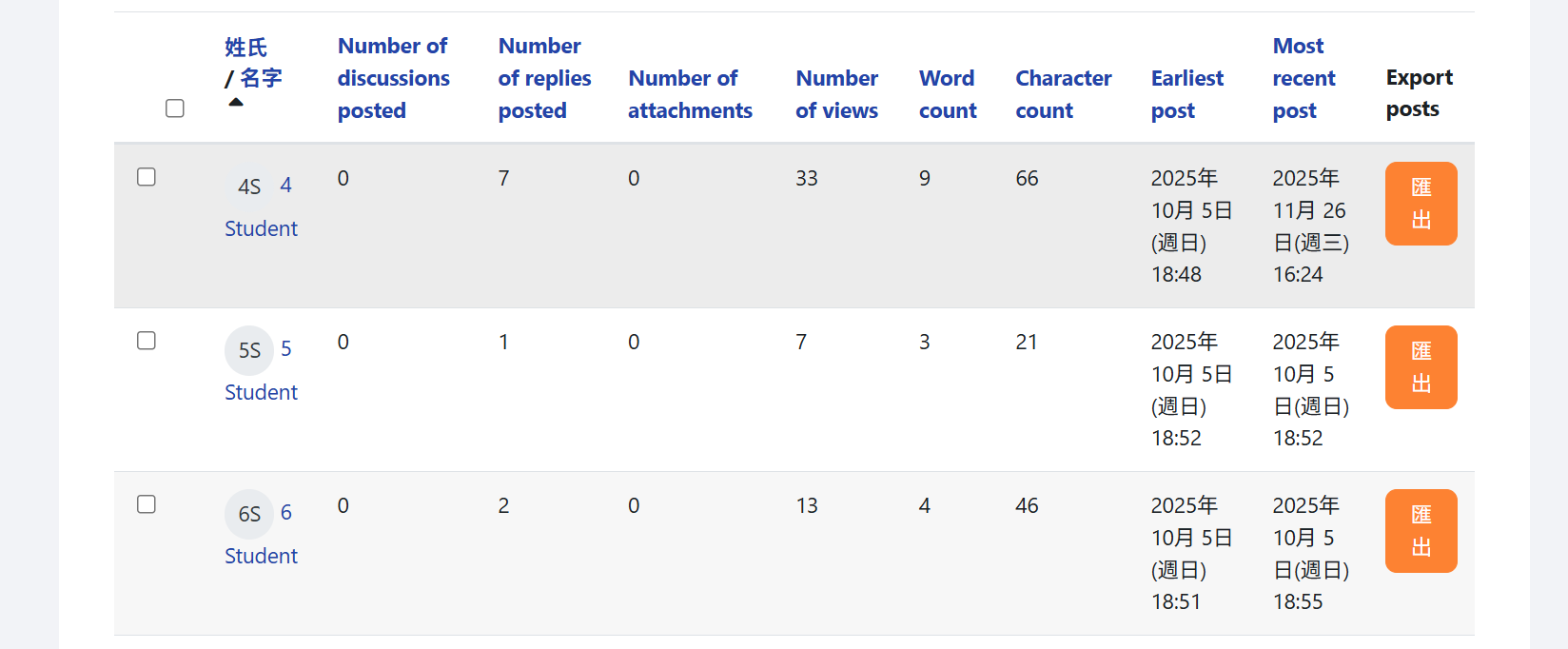 下圖以一個實際例子說明:在「討論區總結報告」中,若某位學生的 Number of discussions postedNumber of replies posted 均偏低,但 Number of views 較高,教師便可推斷該生主要以瀏覽為主、較少主動發言,從而考慮在課堂中主動提問或提供更多發言機會;相反,若學生的發帖及回覆次數都很高,則顯示其在討論中十分活躍,教師可進一步引導其擔任小組召集人或學習夥伴角色。下圖即為「討論區總結報告」的示例畫面。