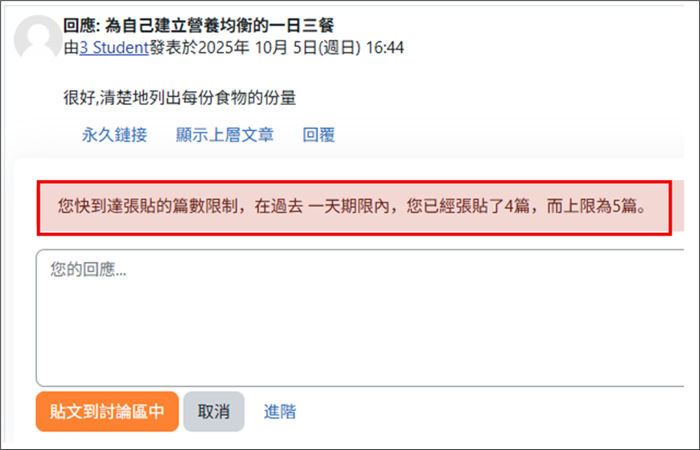 - 警告門檻:當貼文數接近上限時,系統會顯示警告訊息,提醒學生注意。