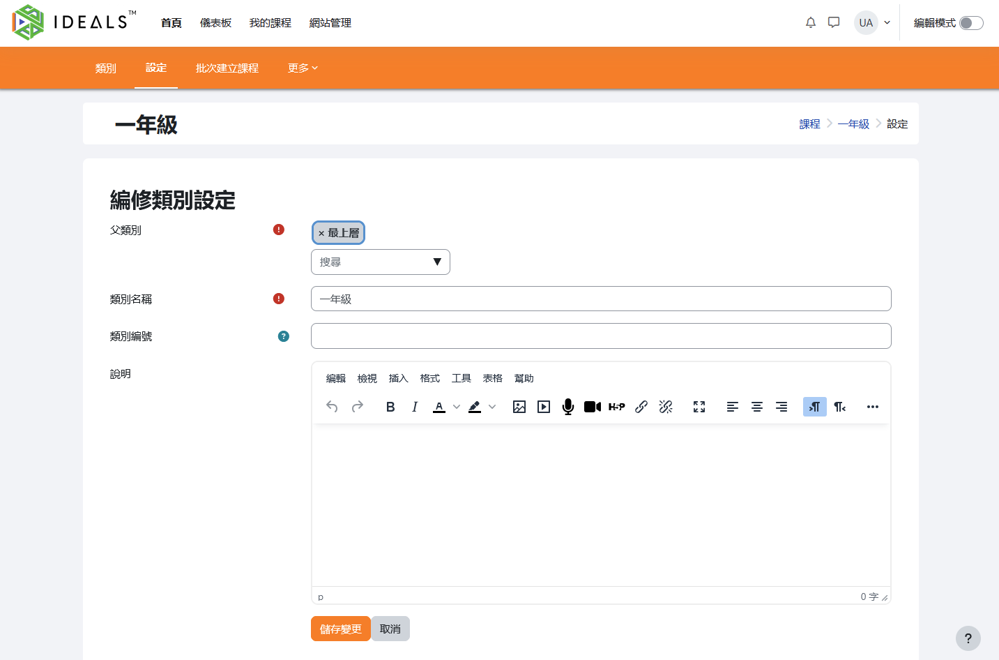 On the "Manage Course Categories and Courses" page (for instructions on how to access this page, please refer to 2.3.1), find the category you want to edit in the category list on the left. Click the "gear" icon (⚙️) next to it, then select "Edit" from the menu.