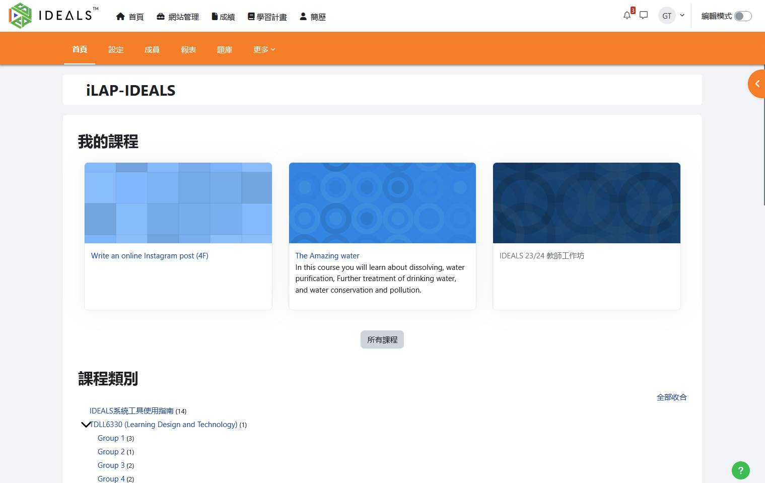 老師登入 iLAP 首頁後,可直接在首頁的「我的課程」區域,或瀏覽課程類別清單,點擊進入一個目標課程。