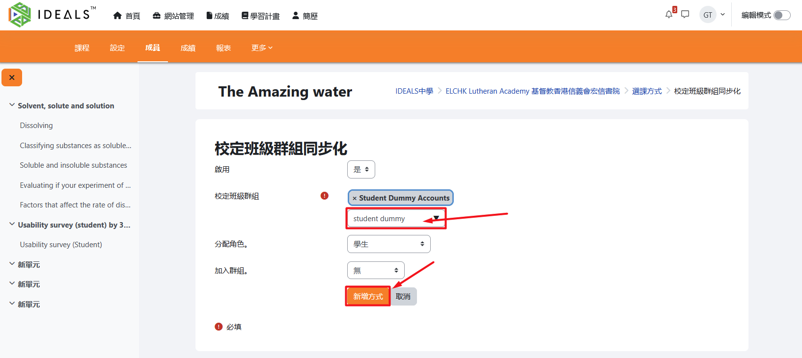 可依需要選擇是否將學生加入某一課程群組。可依需要選擇是否將學生加入某一課程群組,不建議在此管理。 - 確認設定後,點選「新增方式」完成設定。