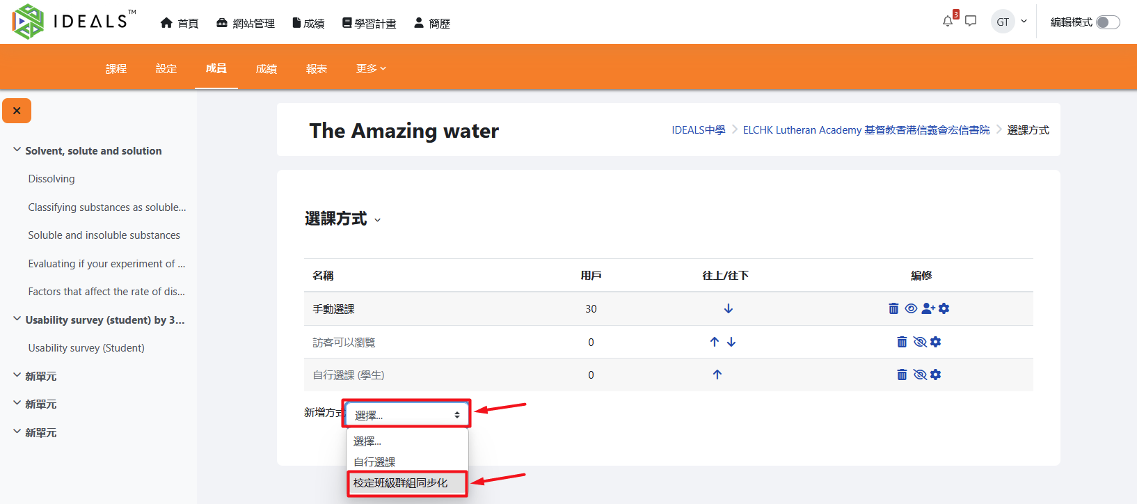 於課程內,點選左側選單「於目標課程內,點擊課程選單中的「成員」,再點擊「已經選課的用戶」打開選單,最後點擊「選課方式」。