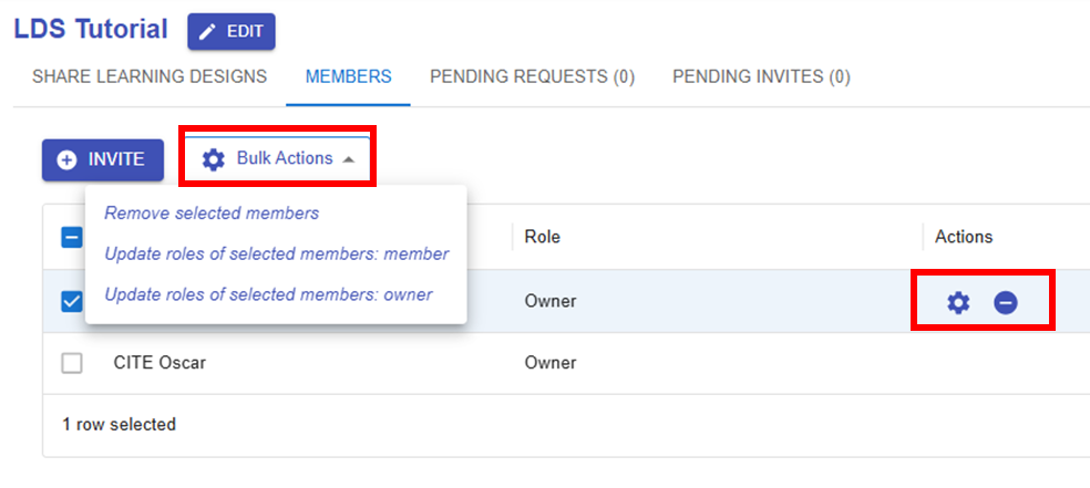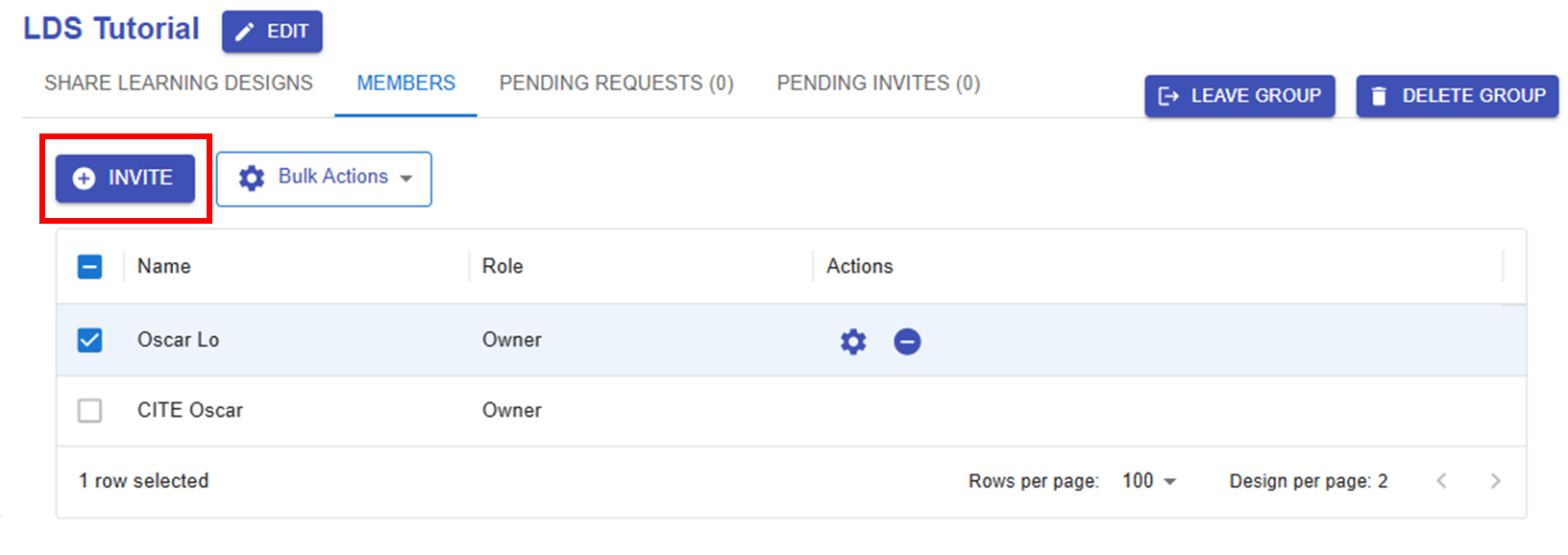By clicking the "SHARE LEARNING DESIGNS" button, you can select an existing design to share and set permissions to either "Can Edit" or "Can View".