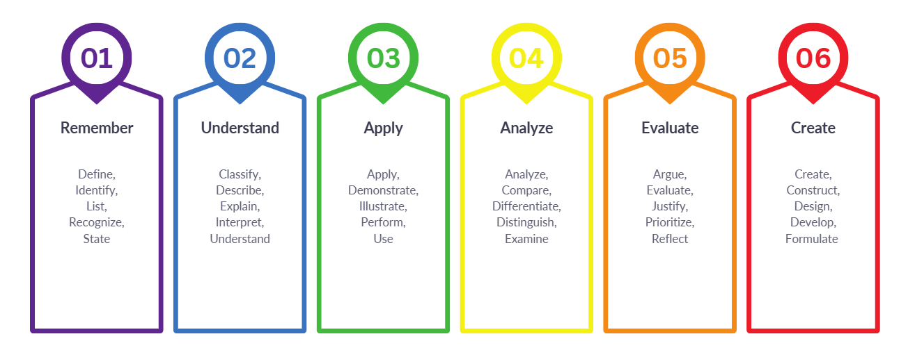 Bloom’s Taxonomy breaks learning into six cognitive levels: