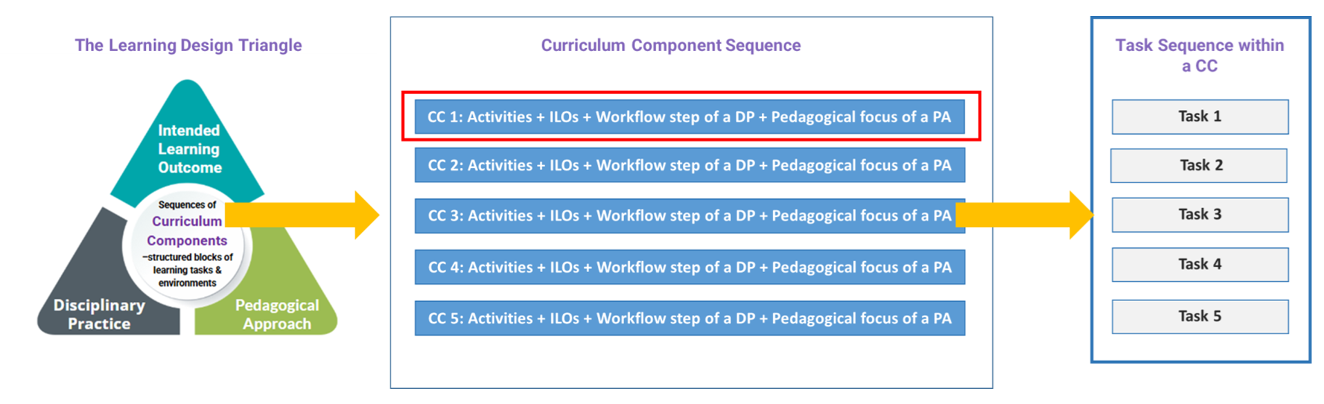 From Sections 2.2 to 2.4, you have explored the three elements of the Learning Design Triangle, which together provide the contextual framework for anchoring the entire learning design. In this section, we will examine the Curriculum Component (CC) Sequence, which serves as a bridge between the abstract Learning Design Triangle and the concrete learning and assessment tasks. The CC Sequence guides learning designers in gradually transforming overarching design concepts into actionable teaching practices.