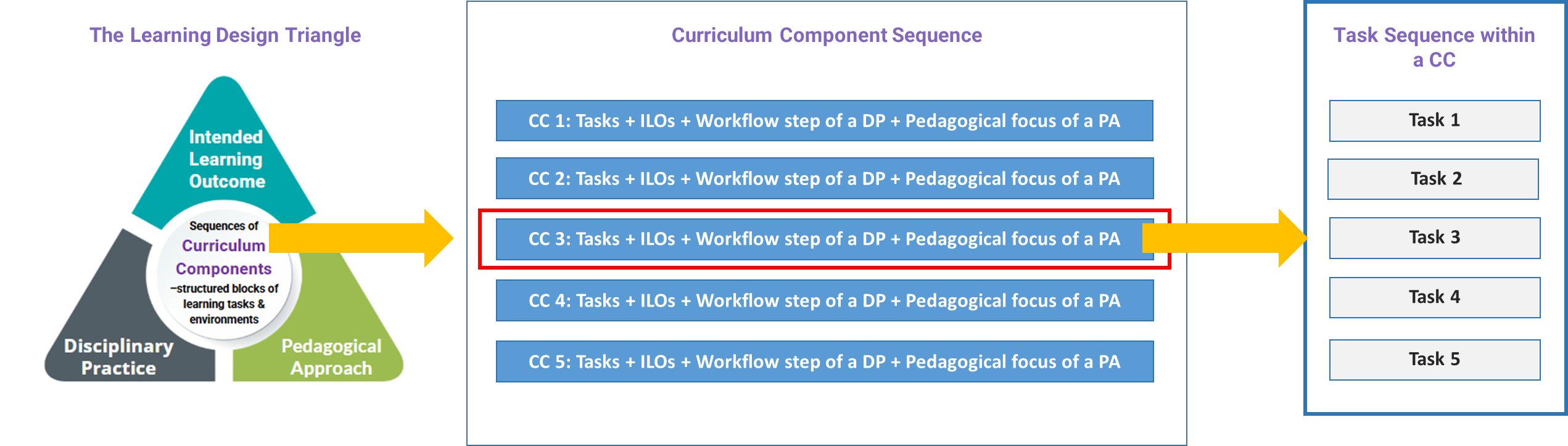 From Sections 2.2 to 2.4, you have explored the three elements of the Learning Design Triangle, which together provide the contextual framework for the entire learning design. In this section, we will examine the Curriculum Component (CC) Sequence, which serves as a bridge between the abstract Learning Design Triangle and the concrete learning and assessment tasks. The CC Sequence guides learning designers in gradually transforming overarching design concepts into actionable teaching practices.