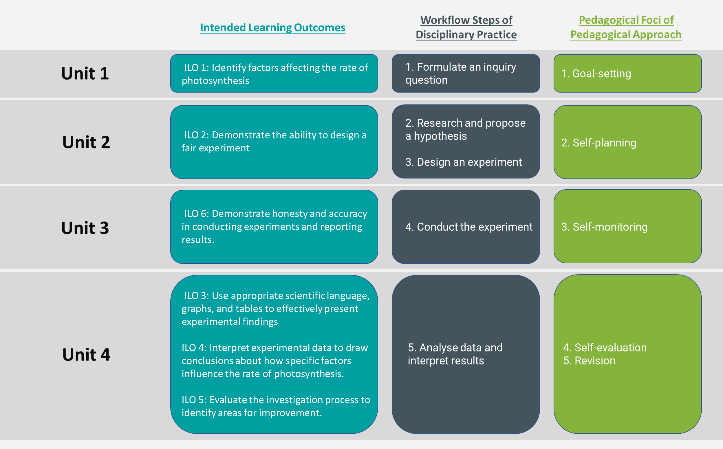 In this section, we will explore how to transform the elements of the Learning Design Triangle (LDT) into a Curriculum Component (CC) Sequence for a STEAM course conceptually. Considering that we are designing a course titled "Scientific Investigations in Photosynthesis".