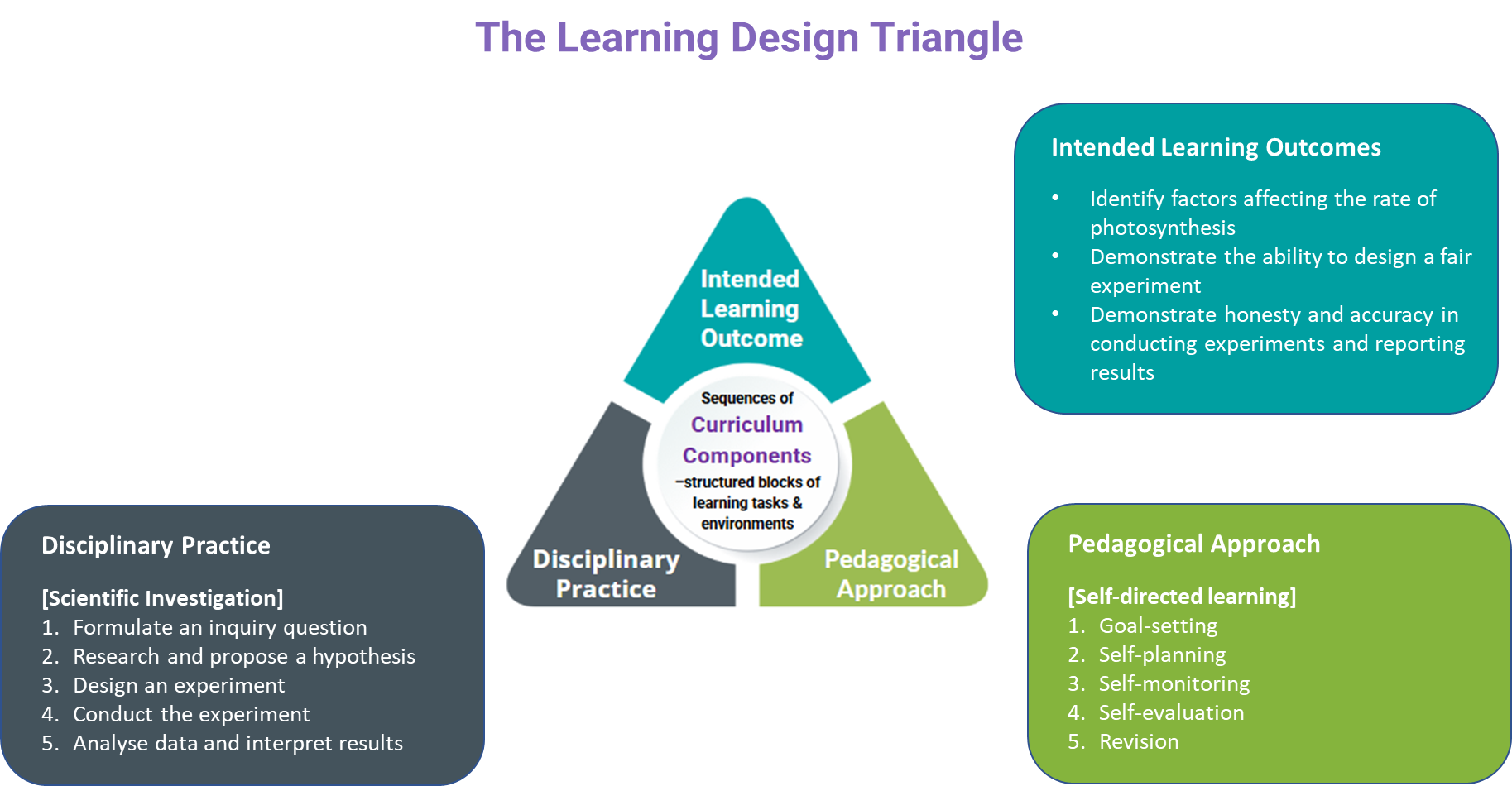 In this section, we will explore how to transform the elements of the Learning Design Triangle (LDT) into a Curriculum Component (CC) Sequence for a STEAM course conceptually. Considering that we are designing a course titled "Scientific Investigations in Photosynthesis".