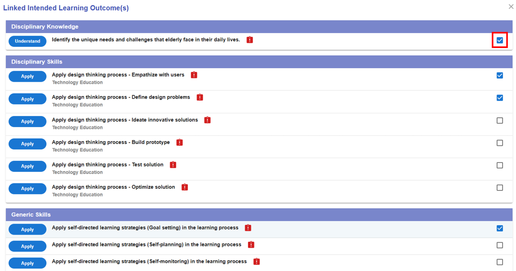 - After an assessment is assigned to a specific learning outcome, the alert icon