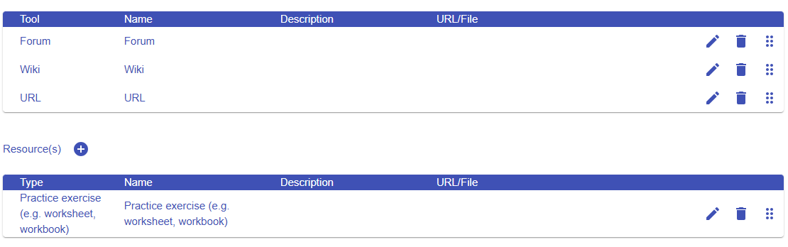 The resource section allows you to select the type of resource or tool you want to use to support the learning process.