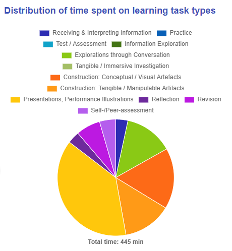 The two diagrams above illustrate how the workflow steps of disciplinary practice and the pedagogical focus of the chosen pedagogical approach are arranged within your learning design. Additionally, the dashboard shows both the total time allocated for all learning tasks and the specific time dedicated to in-class activities, helping to ensure that the out-of-class workload remains manageable.